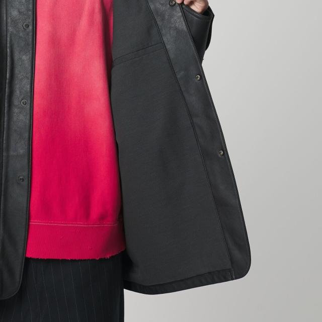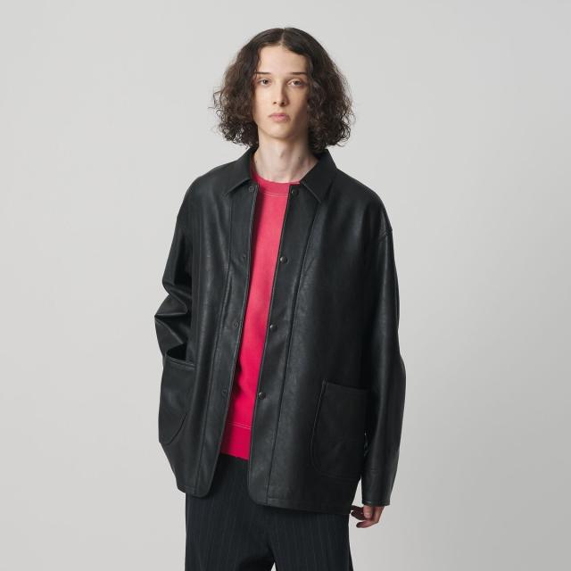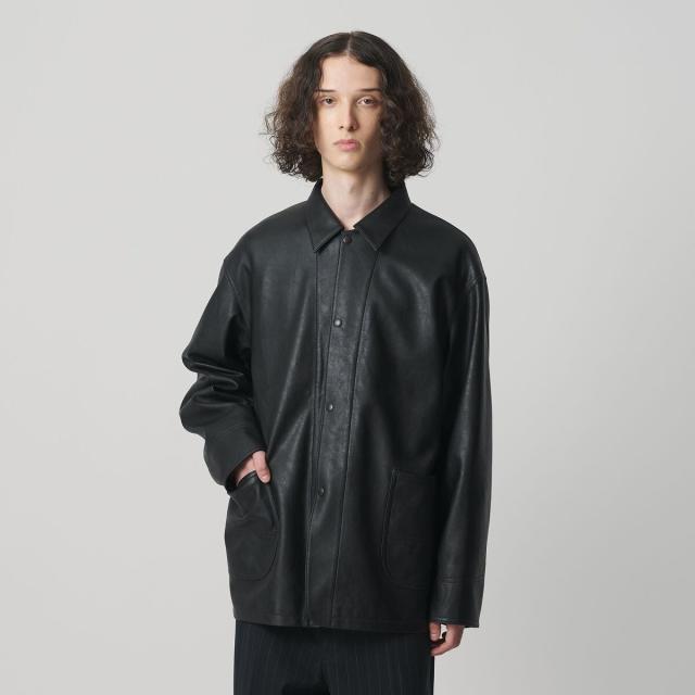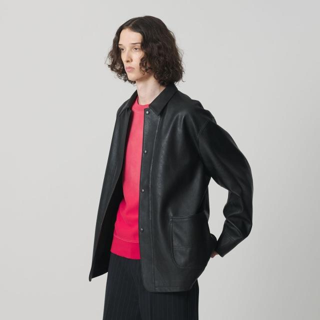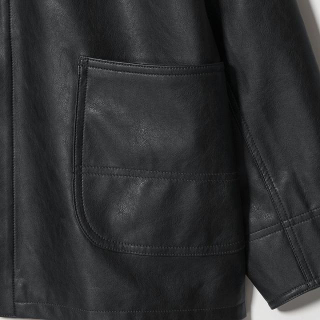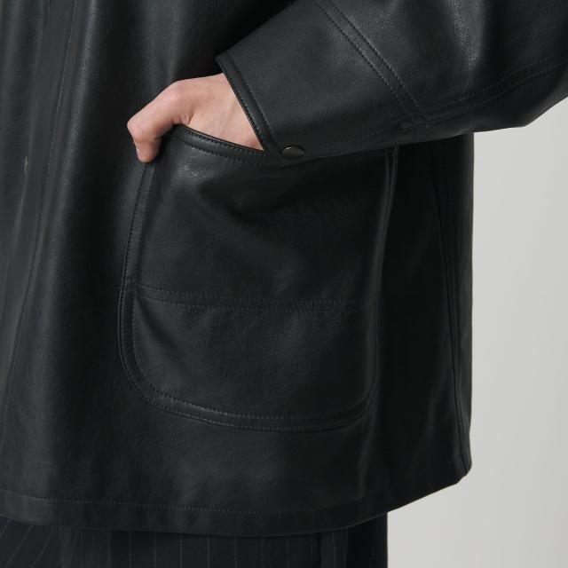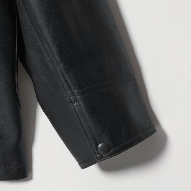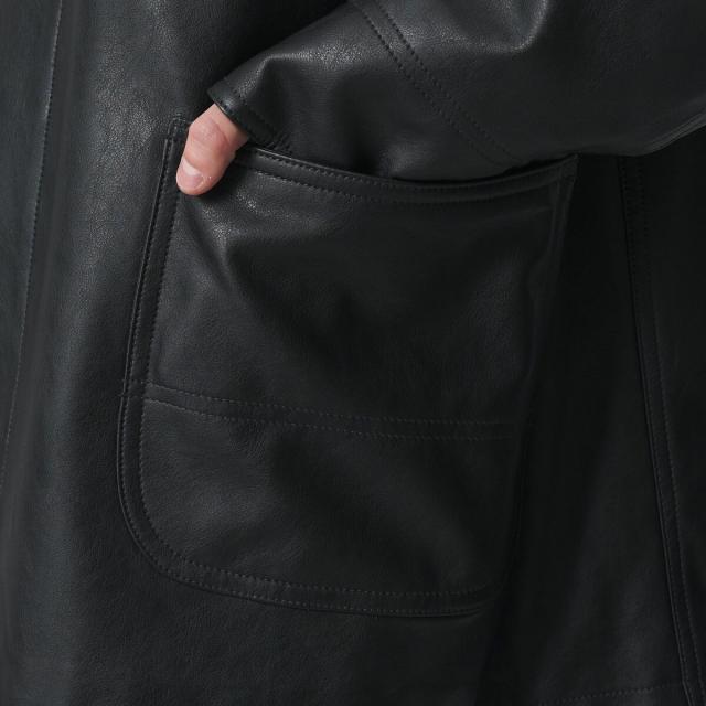 薄手ながらリアルレザーにも引けを取らない、上質な表情のレザーライク素材を使用したカバーオール。