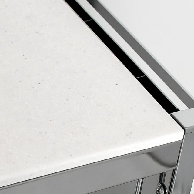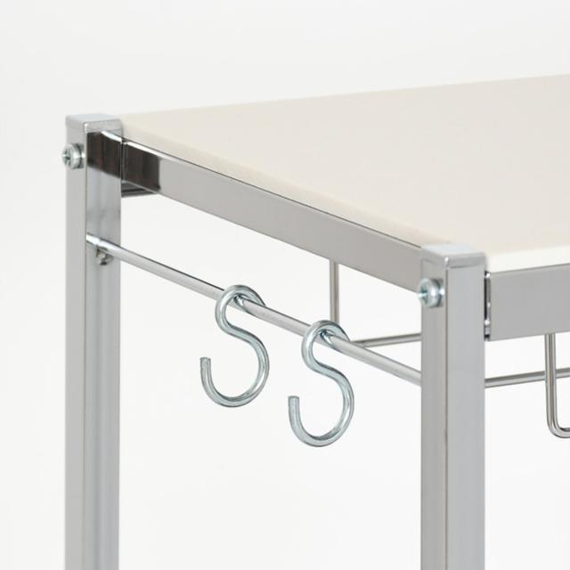 天板に人工大理石を使用したスタイリッシュな作業台です。ステンレスのシルバーに人工大理石のホワイトがアクセントで高級感があります。機能性も充実していて作業台としてはもちろん、収納ボックスを使って食品ストックを入れたり、ステンレスの棚板には電気ケトルなどの小型家電を置いてキッチンラックとしても活躍します。キッチンの他に、洗面所で小物やタオルを収納するのにもぴったりです。
