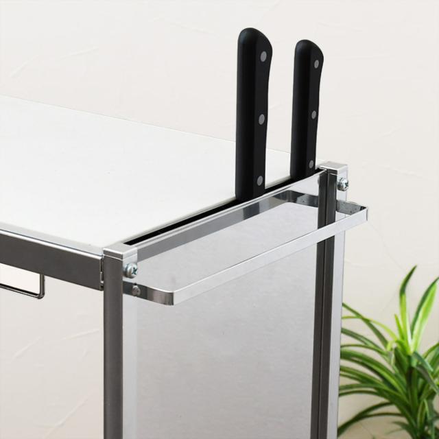 包丁立てが付いているので、作業台に調理器具をひとまとめにできて調理がはかどります。移動の際や作業時にも包丁が収納でき、落とす心配がないので安心です。また、布巾掛けにも使える取っ手が付いていて、布巾やタオルを掛けられるのも嬉しいポイントです。