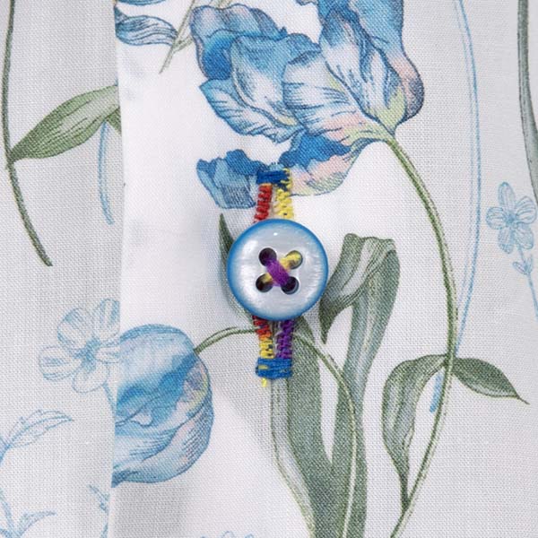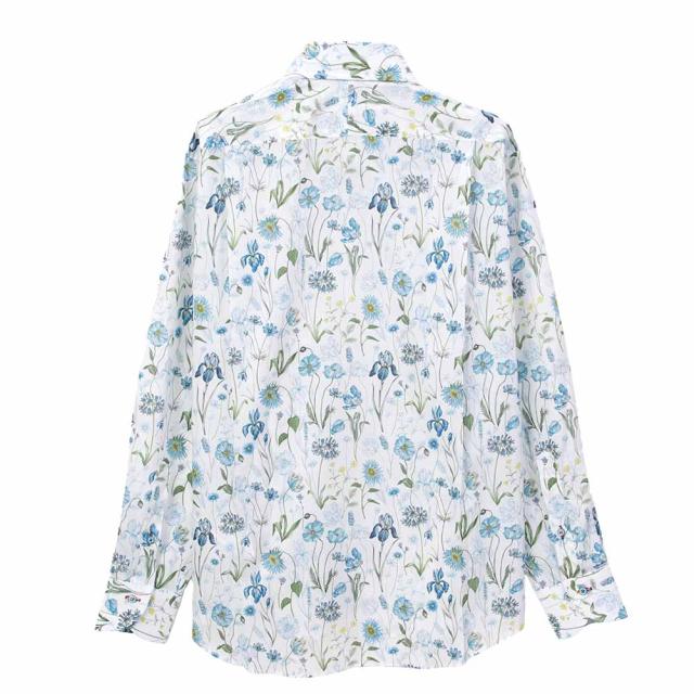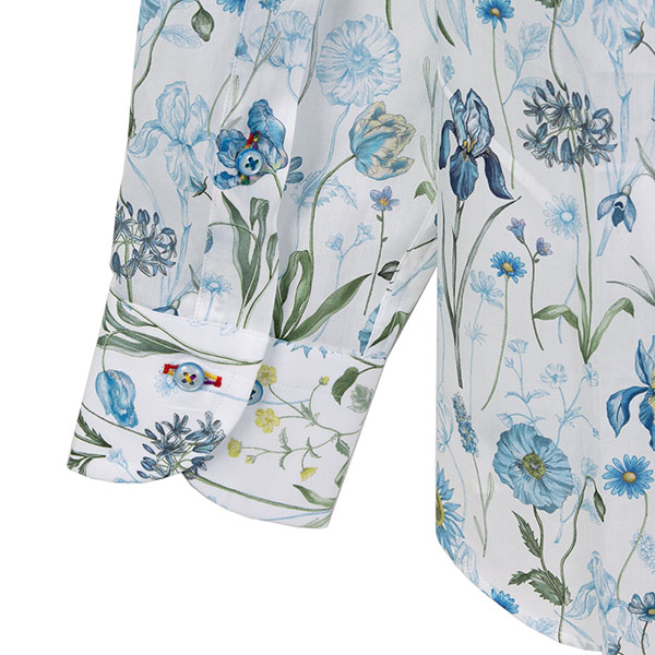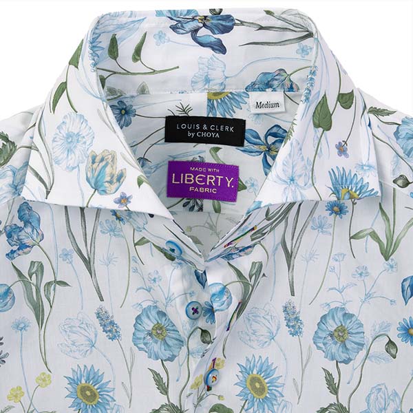 LIBERTY(リバティ)社のタナローン・オリジナルプリント生地を用いたドレスシャツ。LIBERTYの下げ札とルイスとリバティーのダブルネームが、その証となっております。スウィンギング・ロンドンのファッションミューズであり、映画スターでもあったジーン・シュリンプトンが着ていた花柄の衣装からインスピレーションを得た「メドゥ・ミューズ」。ポピー、ヒマワリ、アガパンサス、アイリス、デイジー、スノードロップ、チューリップ、ラベンダー、コスモスなど、植物の数々が繊細なイラストで描かれています。■商品の特徴リバティプリントの生地の代表ともいえるタナローン・綿100%生地。細番手の糸を用いて、薄手ながらもシルクのような手触りと艶をお楽しみください。ボタンは色縁のドーム型ボタンを使用。ボタン付け糸・ボタン穴かがりは虹のグラデーション糸を使用。前立の第2-4ボタンの間隔が狭くなっていますので、胸元の開きの調整が可能です。